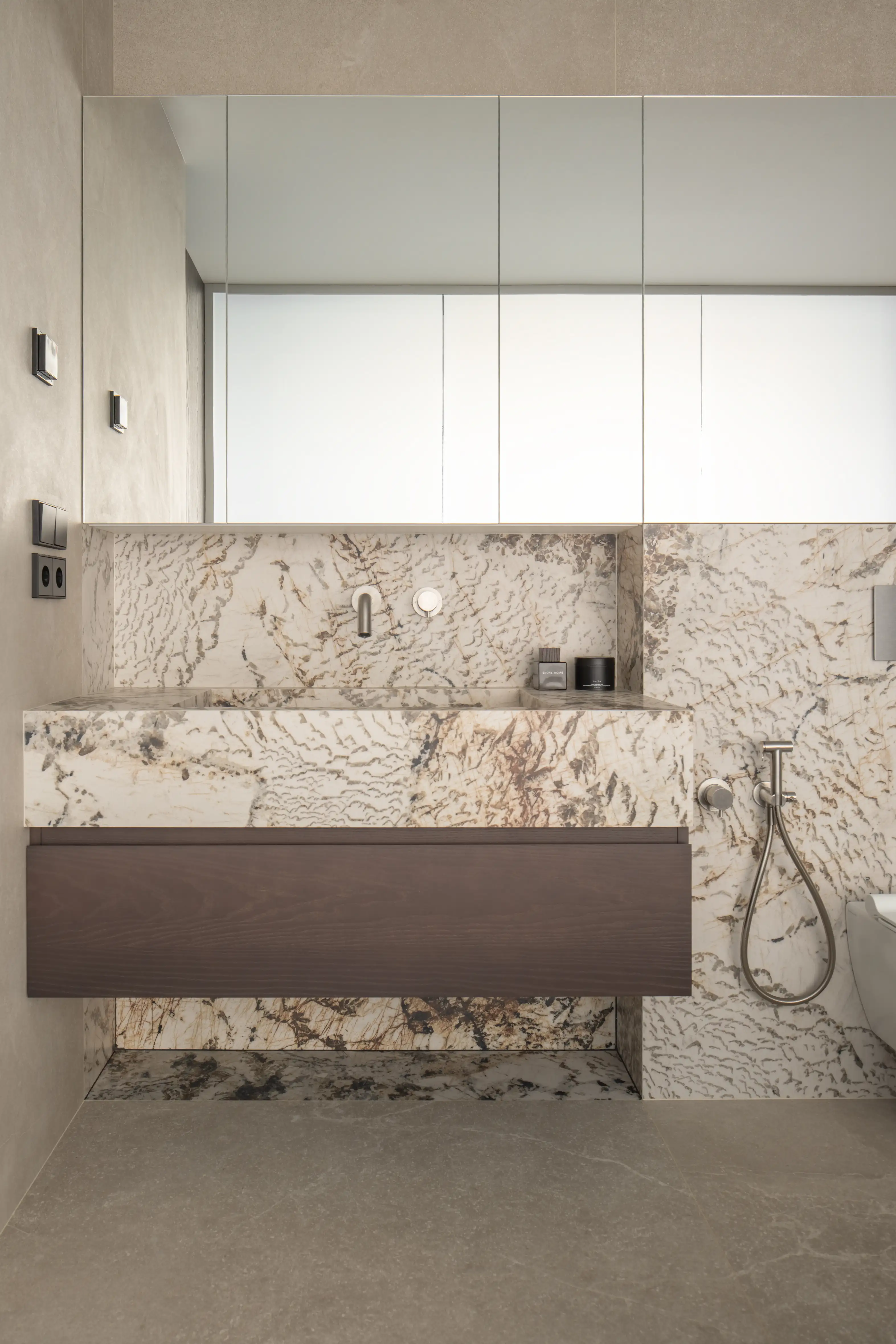 - Стилістика: Спільно обрали стилістику сучасного мінімалізму. Було зроблено ставку на контраст преміальних фактур: великоформатного керамограніту “Патагонія”, темного шпону та графітових поверхонь, що було продемонстровано на фінальних 3D-візуалізаціях.