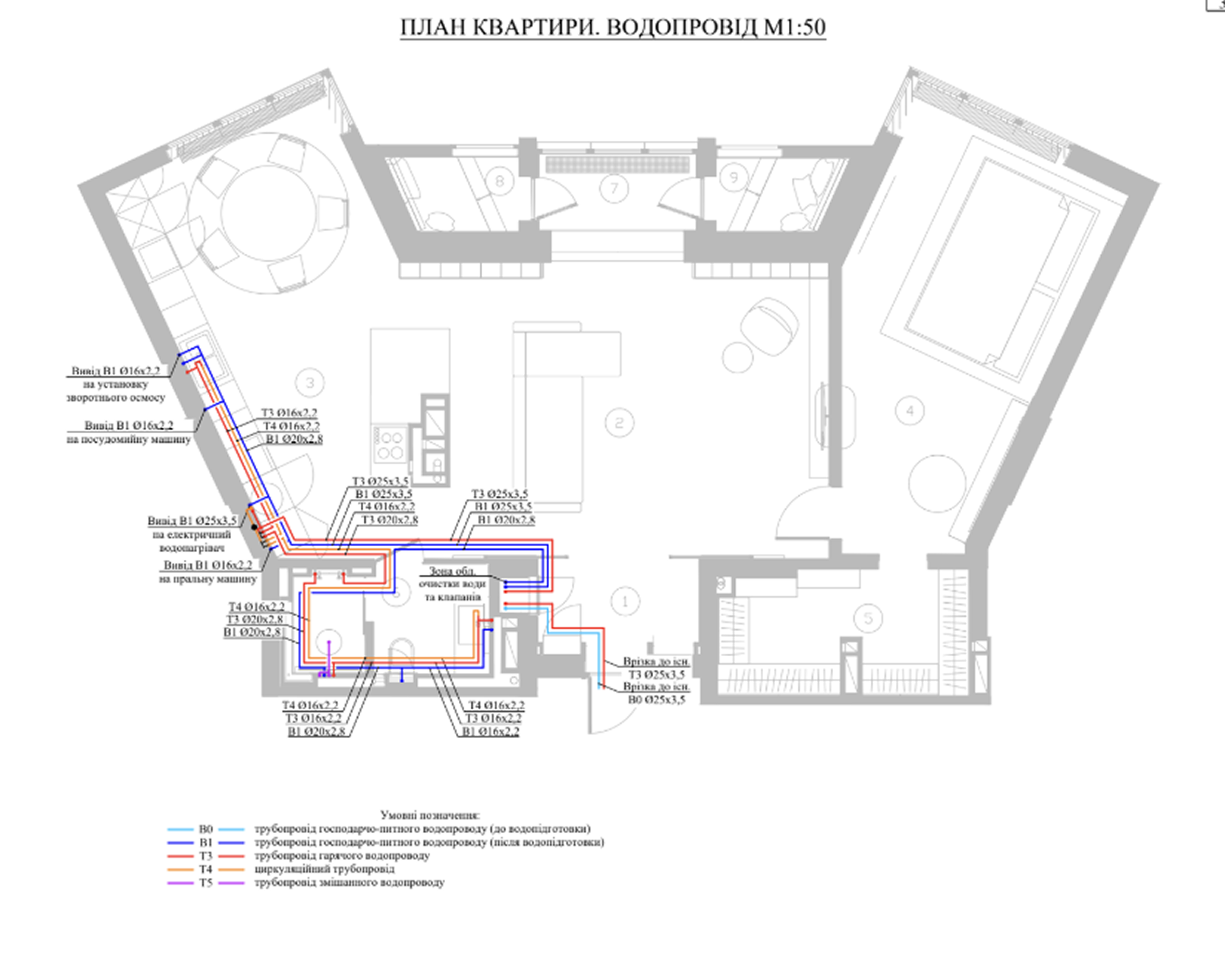 - Водопостачання : Встановлено комплексну систему на трубах REHAU з шумопоглинаючою каналізацією, фільтрацією води та автоматичним захистом від протікань Belimo.