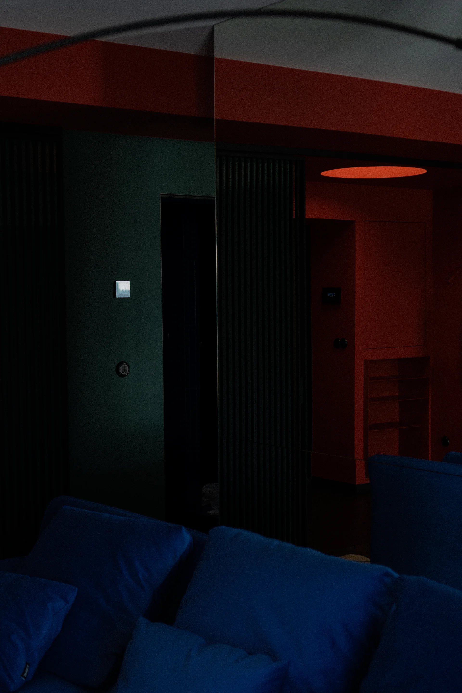 - Оздоблення стін: фарбування у складні відтінки Benjamin Moore та NCS, монтаж шпонованих МДФ-панелей Alpi sottsass red та дизайнерських шпалер.